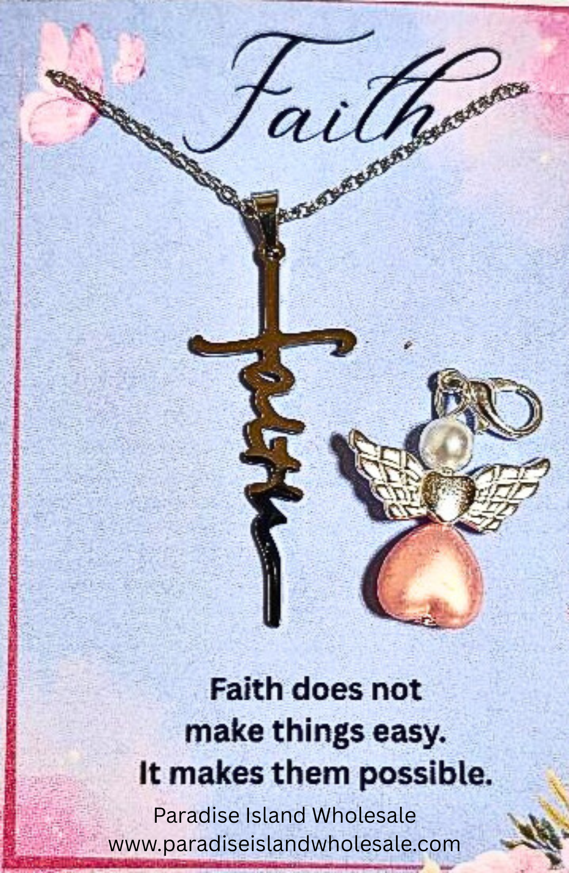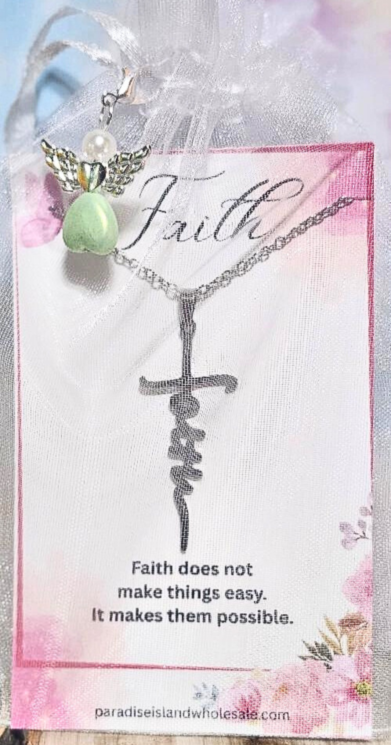Share inspiration with this faith-based gift set, beautifully designed for boutique buyers and outreach ministries. Each set includes a “Faith” pendant necklace, attached to a floral card printed with the uplifting quote: “Faith doesn’t make it easy, it makes it possible.” The card is branded with our business name and website and packaged with care in an organza bag alongside a clip-on angel charm.